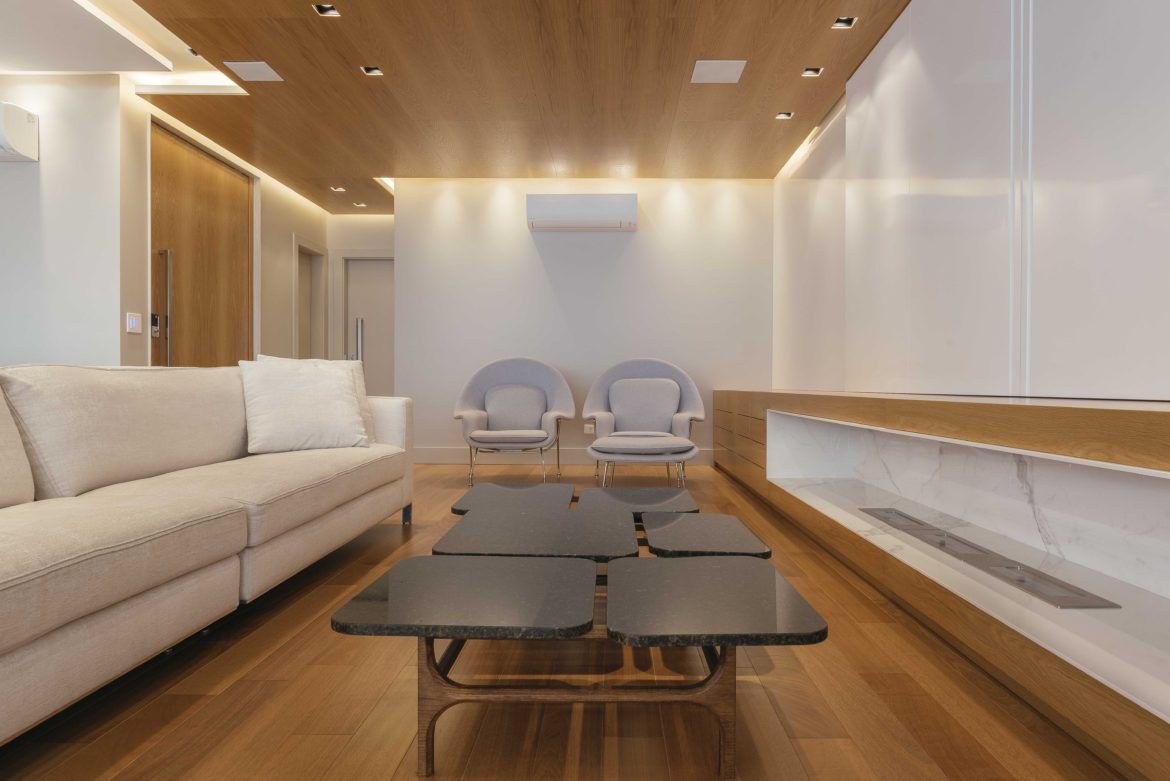 Para suelos de inspiración madera en tonalidades oscuras o con un porcelánico de diseño más rompedor, con carácter y lleno de contrastes, decántate por complementos en colores lisos, estos te permitirán jugar con la profundidad y le darán un toque de sencillez a la decoración del salón